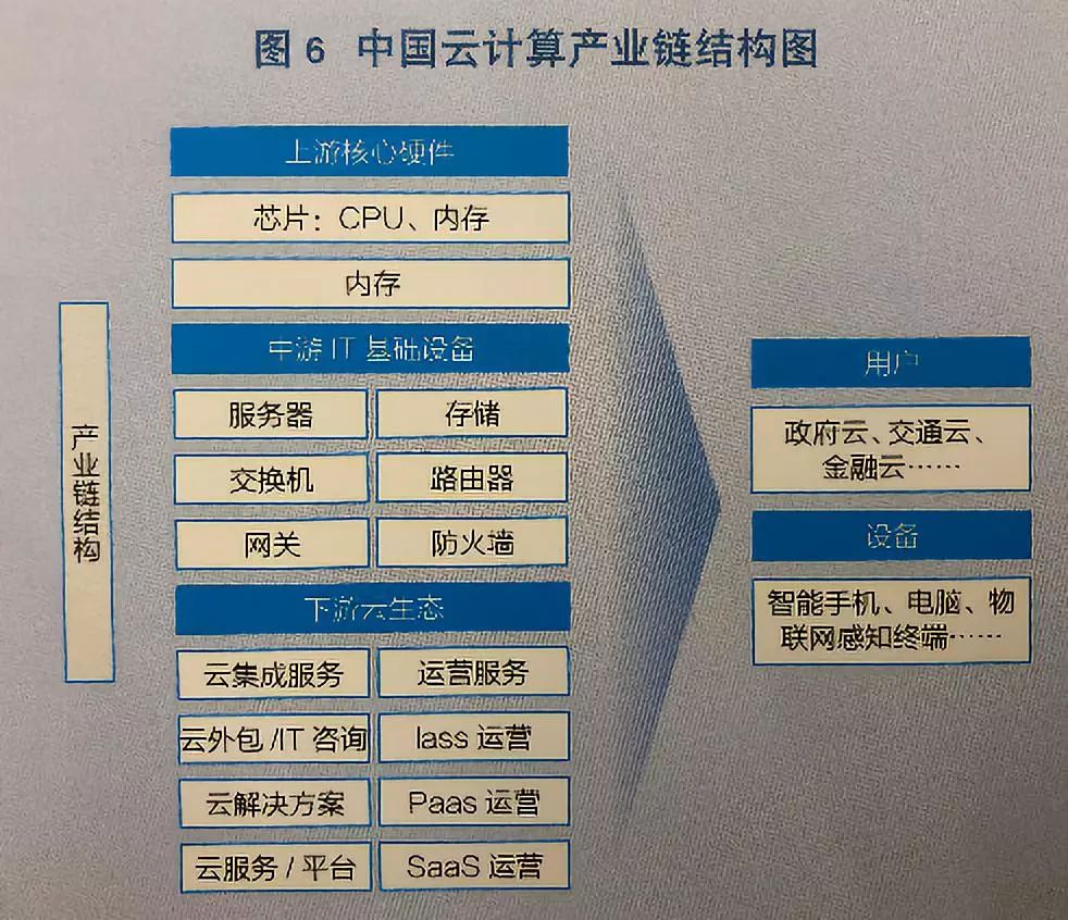 白皮書也重點(diǎn)分析了中國云計算產(chǎn)業(yè)鏈的基本情況。按照產(chǎn)業(yè)機(jī)構(gòu)來看,云計算產(chǎn)業(yè)鏈可以分為上游核心硬件,包括芯片、CPU、內(nèi)存、閃存;中游IT基礎(chǔ)設(shè)備,包括服務(wù)器、存儲設(shè)備、網(wǎng)絡(luò)設(shè)備等;以及下游云生態(tài),包括基礎(chǔ)平臺、云原生應(yīng)用等三部分。