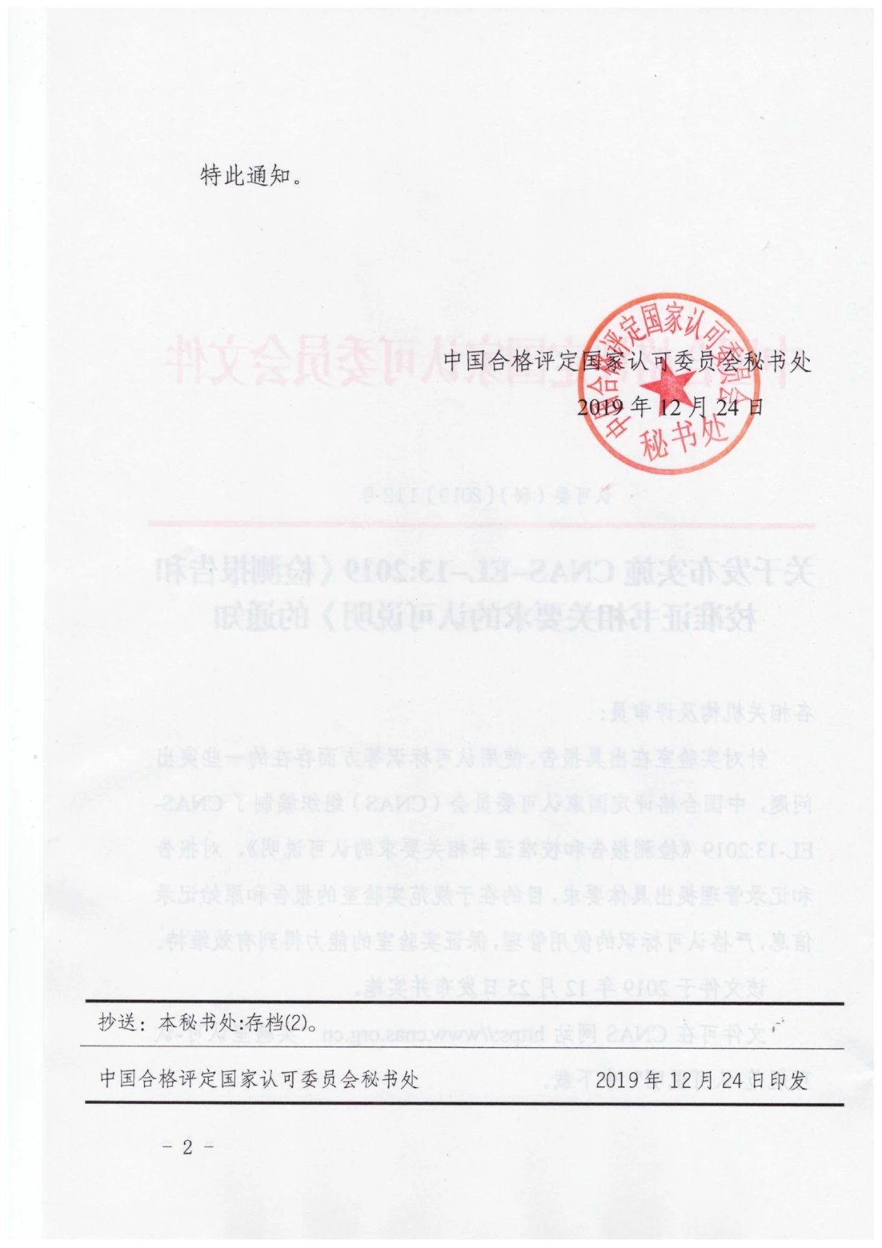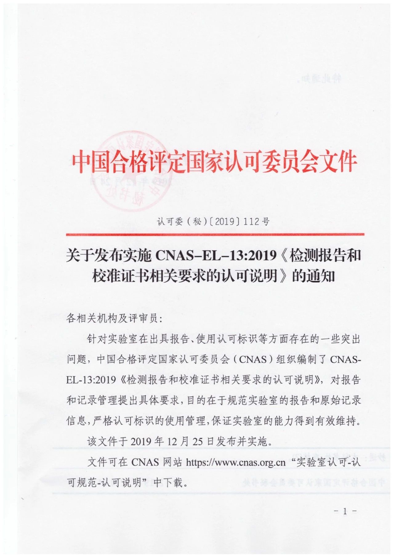 關(guān)于發(fā)布實(shí)施CNAS-EL-13:2019《檢測(cè)報(bào)告和校準(zhǔn)證書(shū)相關(guān)要求的認(rèn)可說(shuō)明》的通知