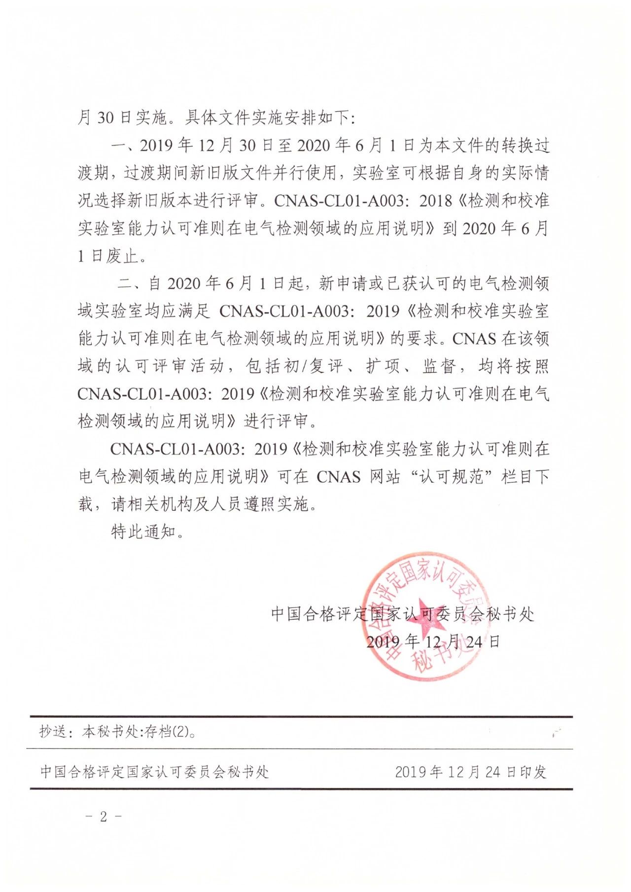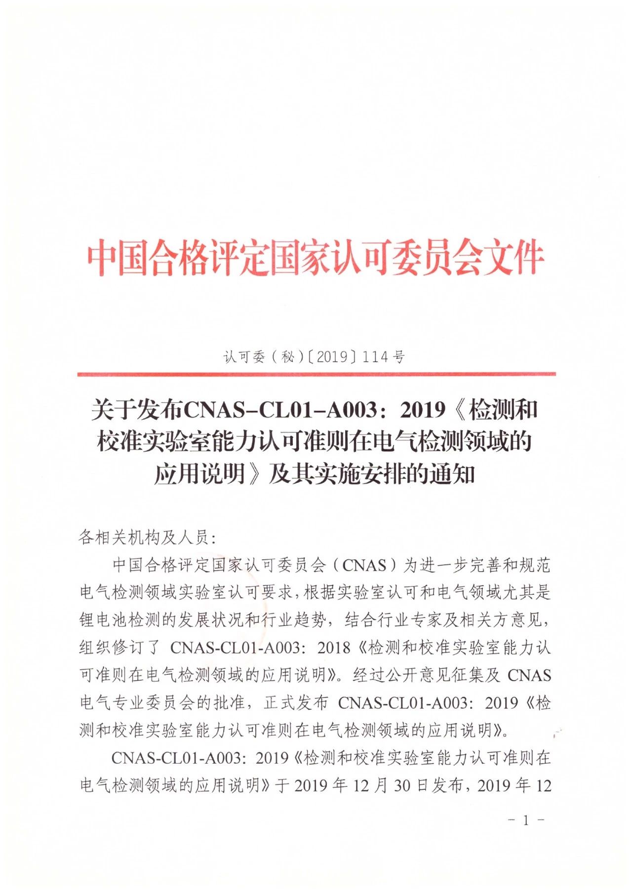 關(guān)于發(fā)布CNAS-CL01-A003:2019《檢測(cè)和校準(zhǔn)實(shí)驗(yàn)室能力認(rèn)可準(zhǔn)則在電氣檢測(cè)領(lǐng)域的應(yīng)用說(shuō)明》及其實(shí)施安排的通知