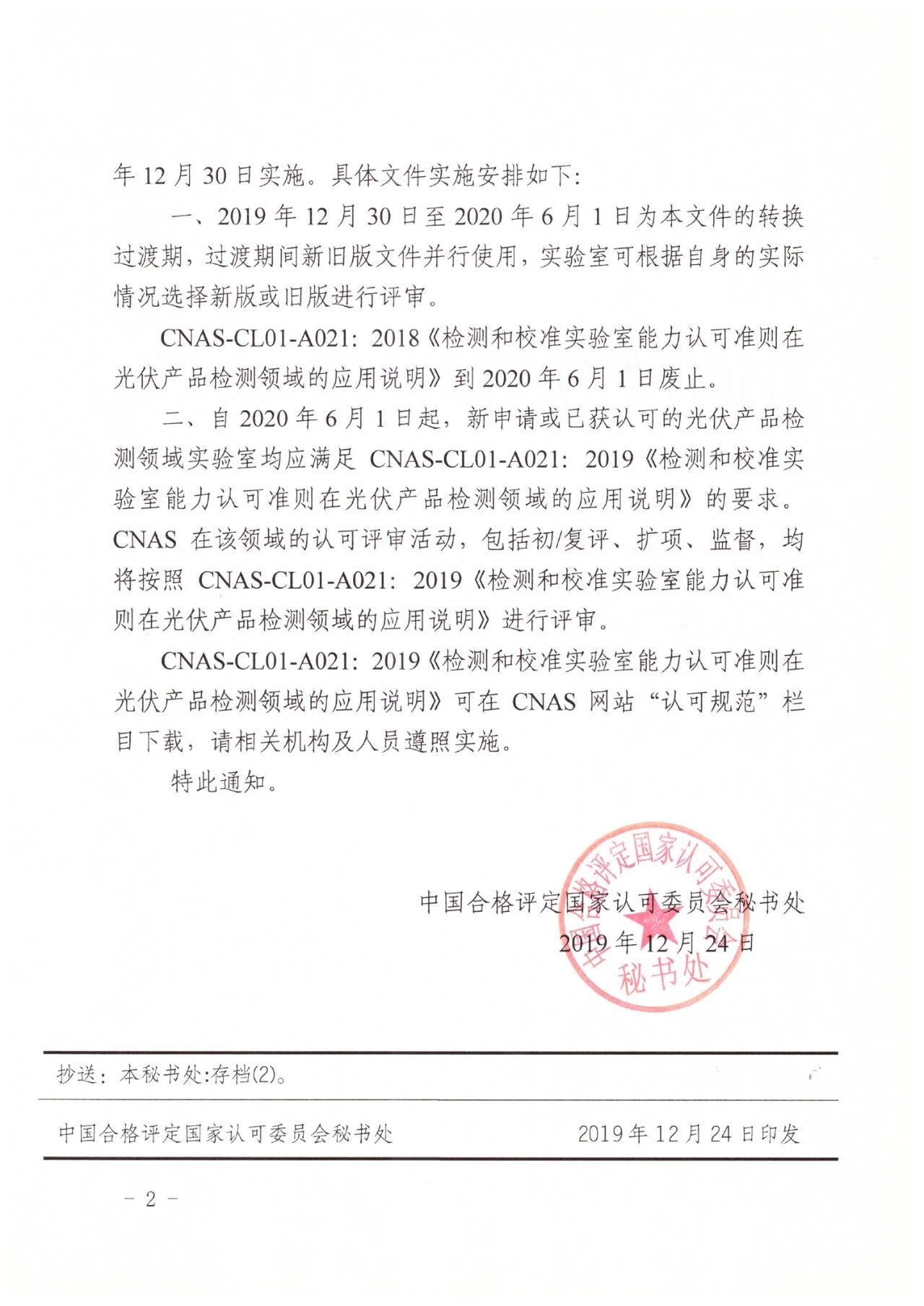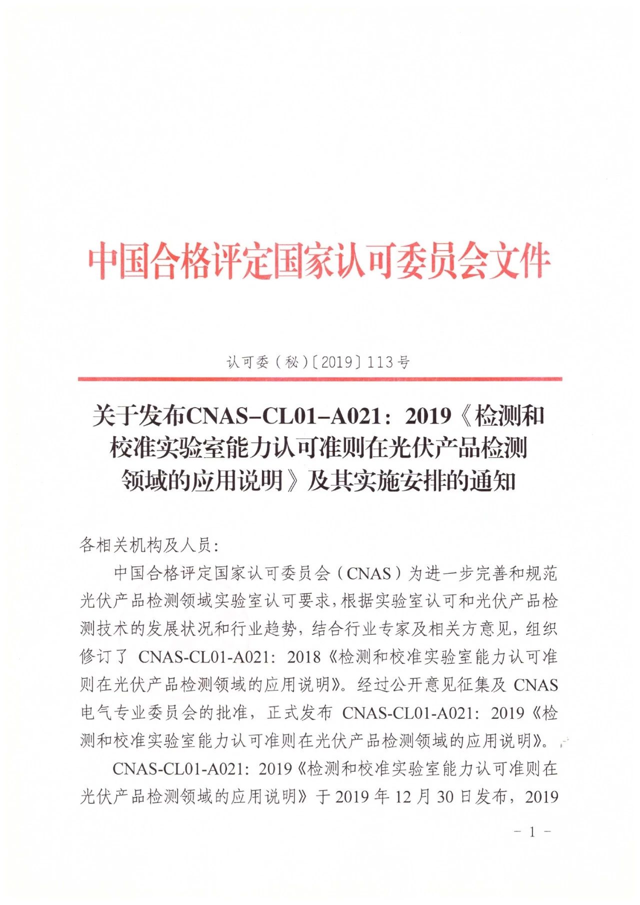 關(guān)于發(fā)布CNAS-CL01-A021:2019《檢測(cè)和校準(zhǔn)實(shí)驗(yàn)室能力認(rèn)可準(zhǔn)則在光伏產(chǎn)品檢測(cè)領(lǐng)域的應(yīng)用說(shuō)明》及其實(shí)施安排的通知
