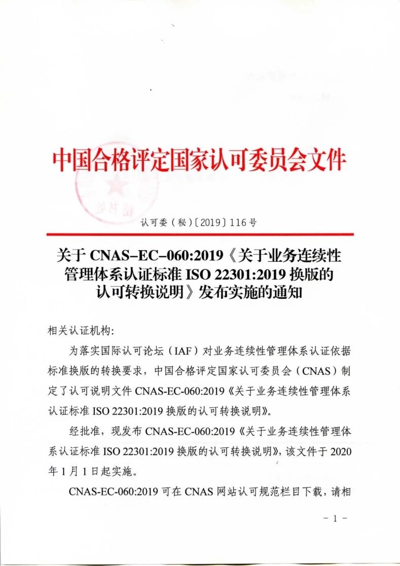 關(guān)于CNAS-EC-060:2019《關(guān)于業(yè)務(wù)連續(xù)性管理體系認(rèn)證標(biāo)準(zhǔn)ISO22301:2019換版的認(rèn)可轉(zhuǎn)換說(shuō)明》發(fā)布實(shí)施的通知