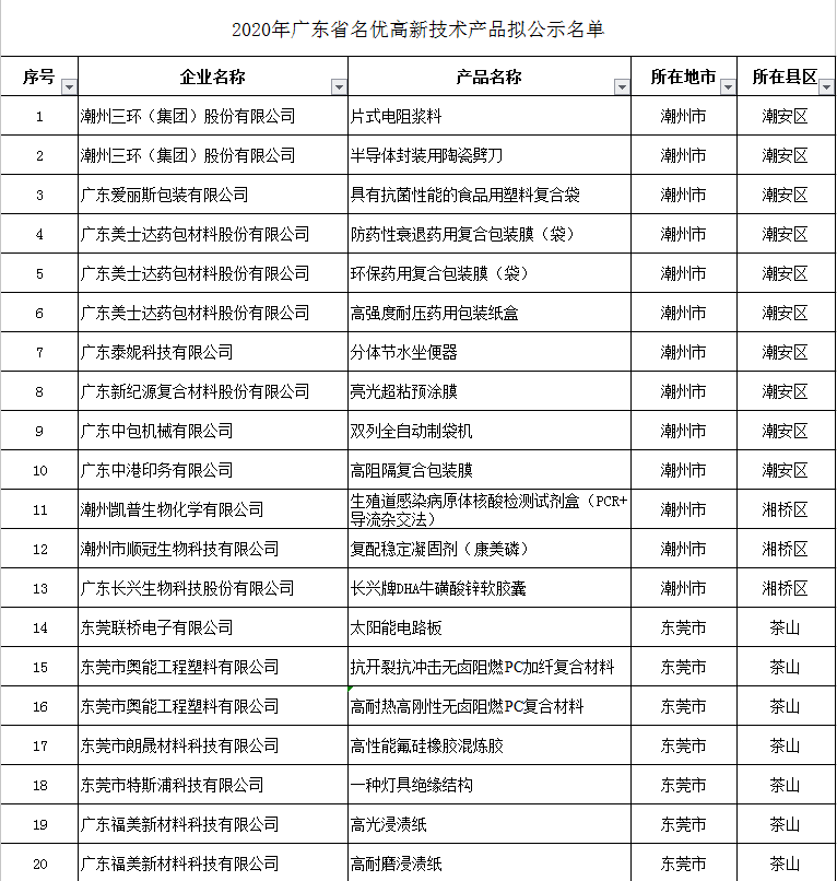 官方公示文件,全部名單點(diǎn)擊關(guān)于2020年廣東省名優(yōu)高新技術(shù)產(chǎn)品擬通過評選名單的公示下載。